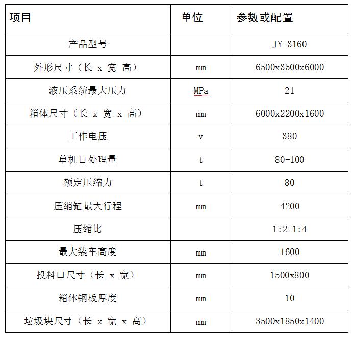 JY-3160 水平式四柱舉升垃圾壓縮設備主要用于對城鎮(zhèn)內小區(qū)、居民點、學校、醫(yī)院、公園景區(qū)、廠礦和機關院校的生活垃圾以及固體廢棄物的收集、壓縮減容和封閉轉運。