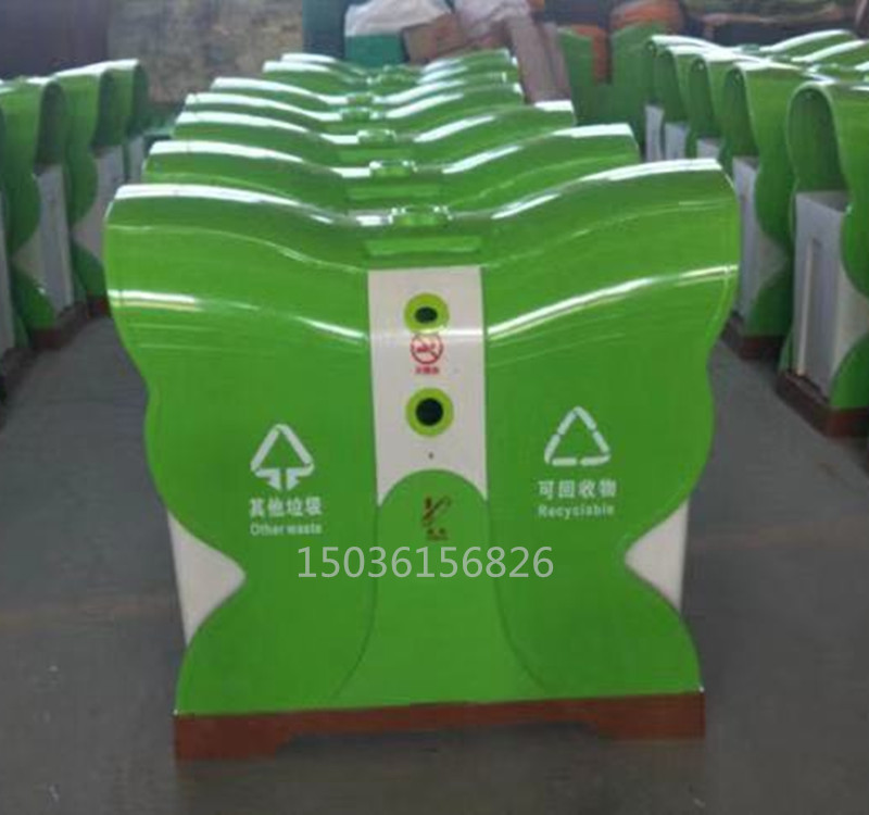 蝴蝶型分類環保垃圾桶果皮箱采用SMC復合材料,3500噸壓機模壓成型,內外光潔度一致。